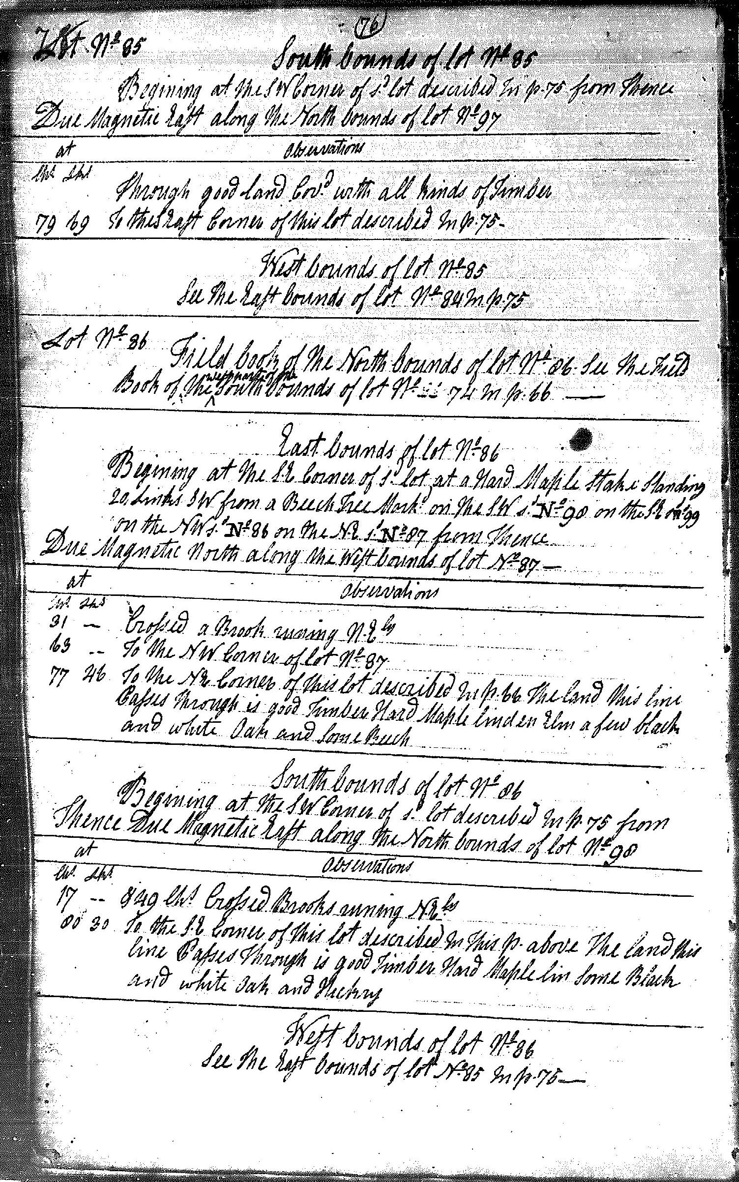 Begining at the S.E. Corner of S’d lot at a Hard Maple Stake Standing 20 Links SW from a Beech Tree Mark’d on the SW s’d No. 98 on the SE s’d No. 99 on the NW s’d No. 86 on the NE s’d No. 87 from Thence Due Magnetic North along the West bounds of lot No. 87—