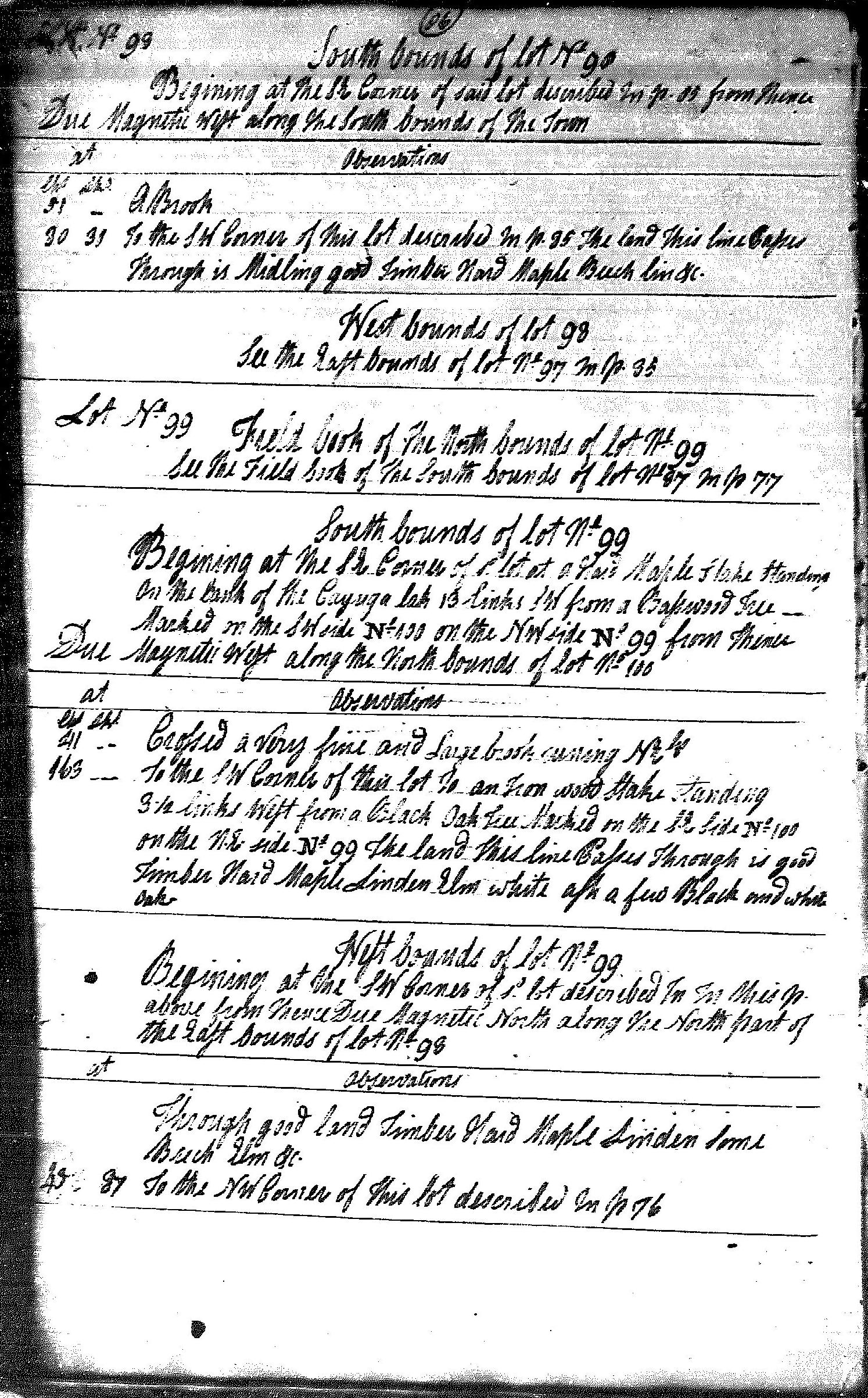 Begining at the SE Corner of S’d lot at a Hard Maple Stake Standing On the Bank of the Cayuga lak 13 links SW from a Basswood Tree—Marked on the SW side No. 100 on the NW side No. 99 from Thence Due Magnetic West along the North bounds of lot No. 100