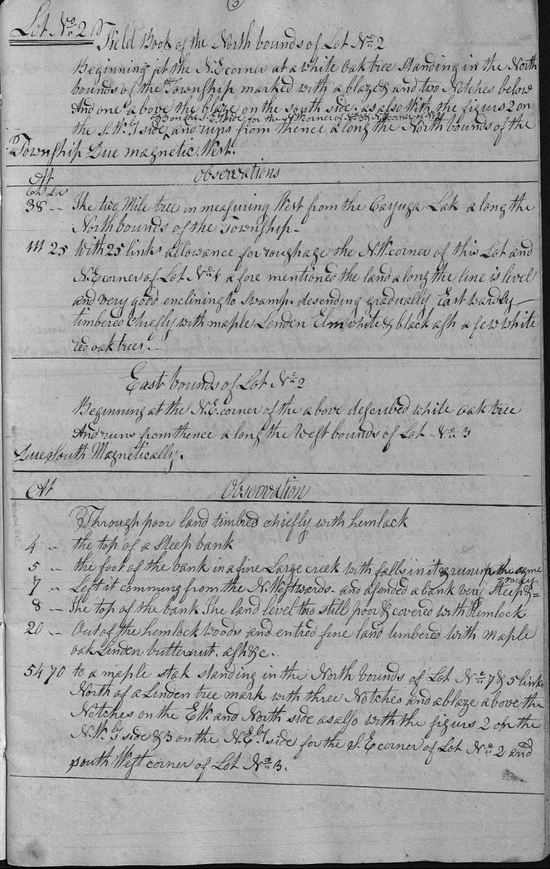 Beginning at the N.E corner at a White Oak tree Standing in the North bounds of the Township marked with a blaze & two Notches below And one above the blaze on the south side as also With the figurs 2 on the S.Wly side & 3 on the S.Ely side for the N.W corner of No. 3 & N.E corner of No. 2 and runs from thence along the North bounds of the