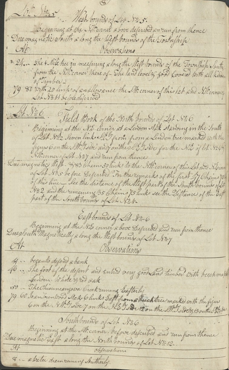 Beginning at the N.E. corner at a Linden stak standing in the South of Lot No.2 Seven links S.Ely from from a Linden tree marked with the Figurs 6 on the S.Wly side and 7 on the S.Ely side for the N.E of lot No.6 & NW. corner of Lot No.7 and run from thence