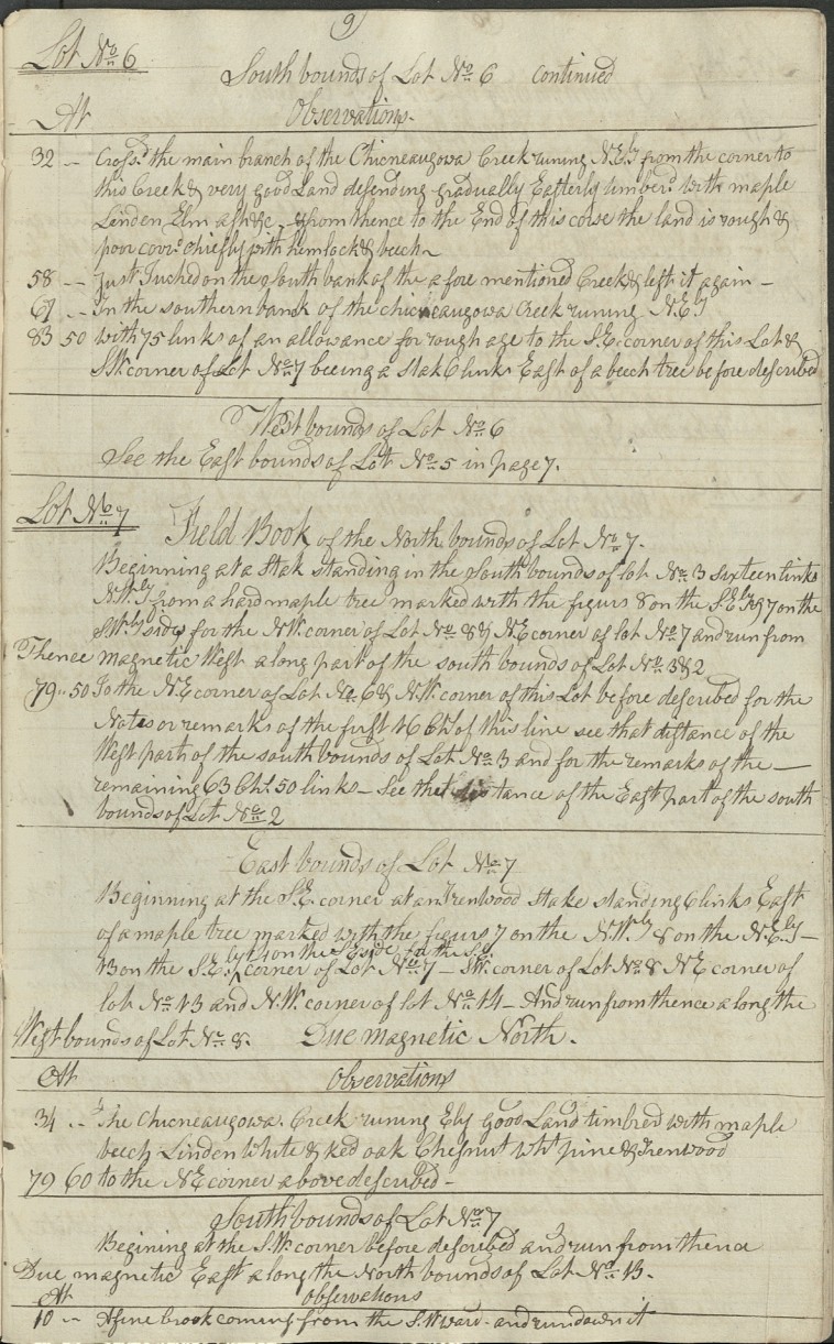 | 32 | - | Cros'd the main branch of the Chicneaugowa Creek running N.Ely from the corner to this Creek & very good land desending gradually Easterly timber with maple Linden Elm ash &c. From thence to the End of this course the land is rough & poor cov'd chiefly with hemlock & beech _ |