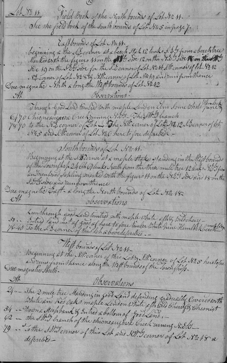 Ch 67 links North from the three mile tree 12 links NEly from an Ironwood Sapling marked with the figurs 11 on the N.Ely side and 18 on the SEly side and run from thence