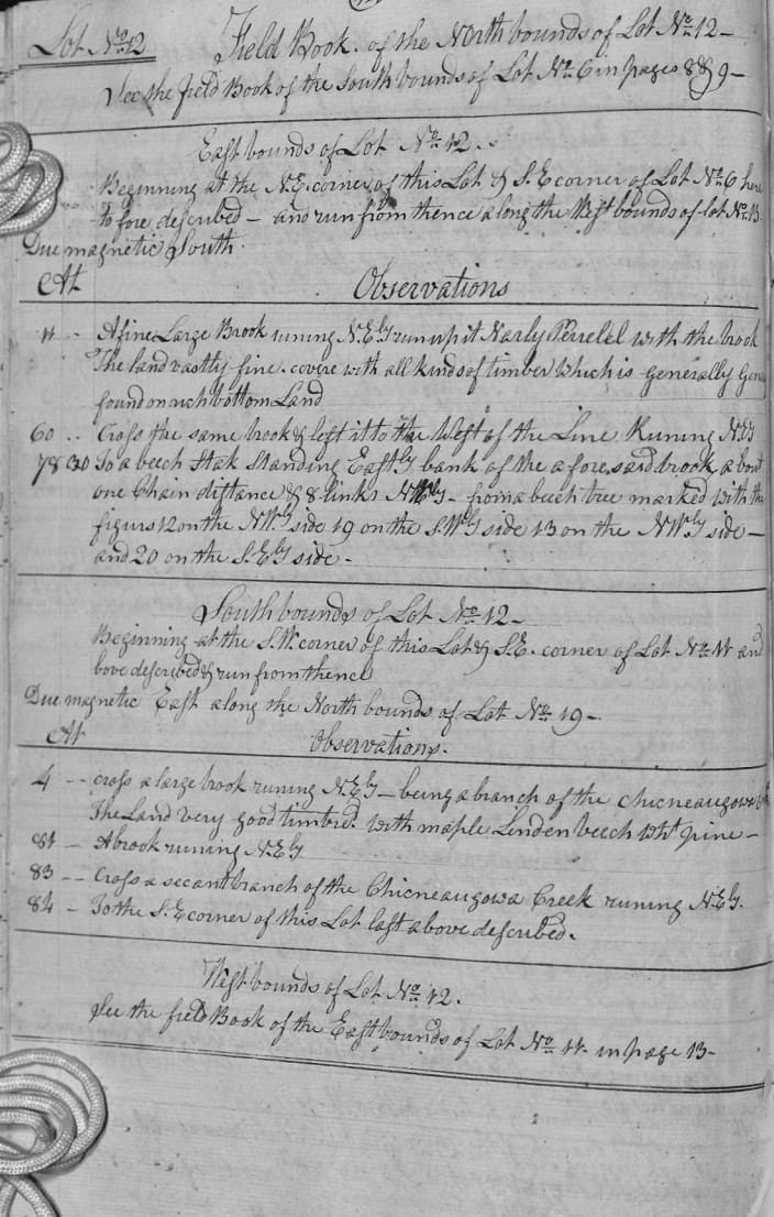 | 4 | - | Cross a large brook runing N.Ely - being a branch of the chicneaugowa creek The Land very good timbred. with maple Linden beech wht pine. |