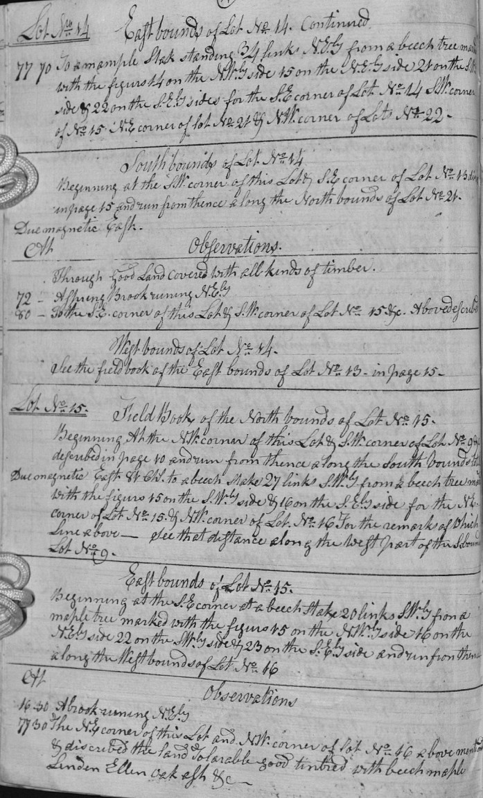 | 77 | 70 | To a mample [maple] Stak standing 34 links N.Ely from a beech tree marked with the figurs 14 on the N.Wly side 15 on the N.Ely side 21 on the S.Wly side & 22 on the S.Ely sides for the S.E corner of Lot No. 14 S.W corner of No. 15 N.E corner of lot No. 21 & N.W corner of Lot No. 22. |