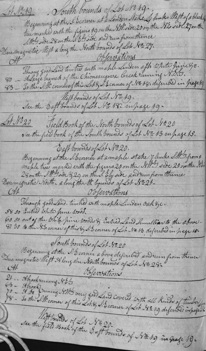 Beginning at the S.E corner at a maple stake 7 links S.Wly from a maple tree marked with the figurs 20 on the NWly side 21 on the NEly side 28 on the S.Wly side & 29 on the S.Ely side and run from thence