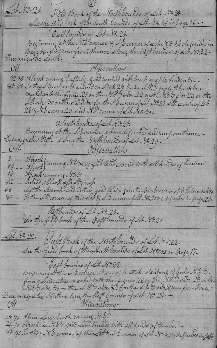 | 81 | 60 | To the S.E corner to a Linden Stak 23 links S.Wly from A beech tree marked with the figurs 21 on the N.Wly side 22 on the N.Ely side 29 on the S.W side 30 on the S.Ely side for the SE corner of Lot No. 21 SW. corner of Lot 22 & N.E corner 29 and NW. corner of Lot No. 30. |