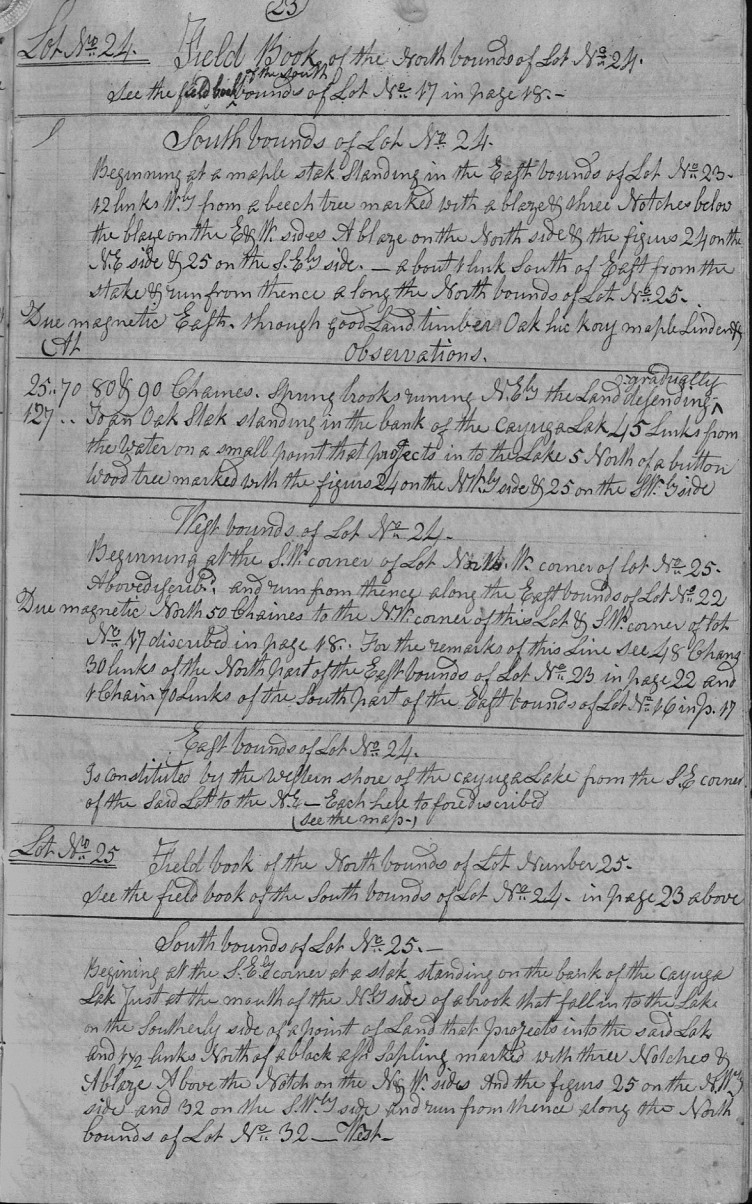 Beginning at a maple stak Standing in the East bounds of Lot No. 23. 12 links Wly from a beech tree marked with a blaze & three Notches below the blaze on the E & W sides A blaze on the North side & the figurs 24 on the N.E side & 25 on the S.Ely side. _ about 1 link South of East from the stake & run from thence along the North bounds of Lot No. 25.