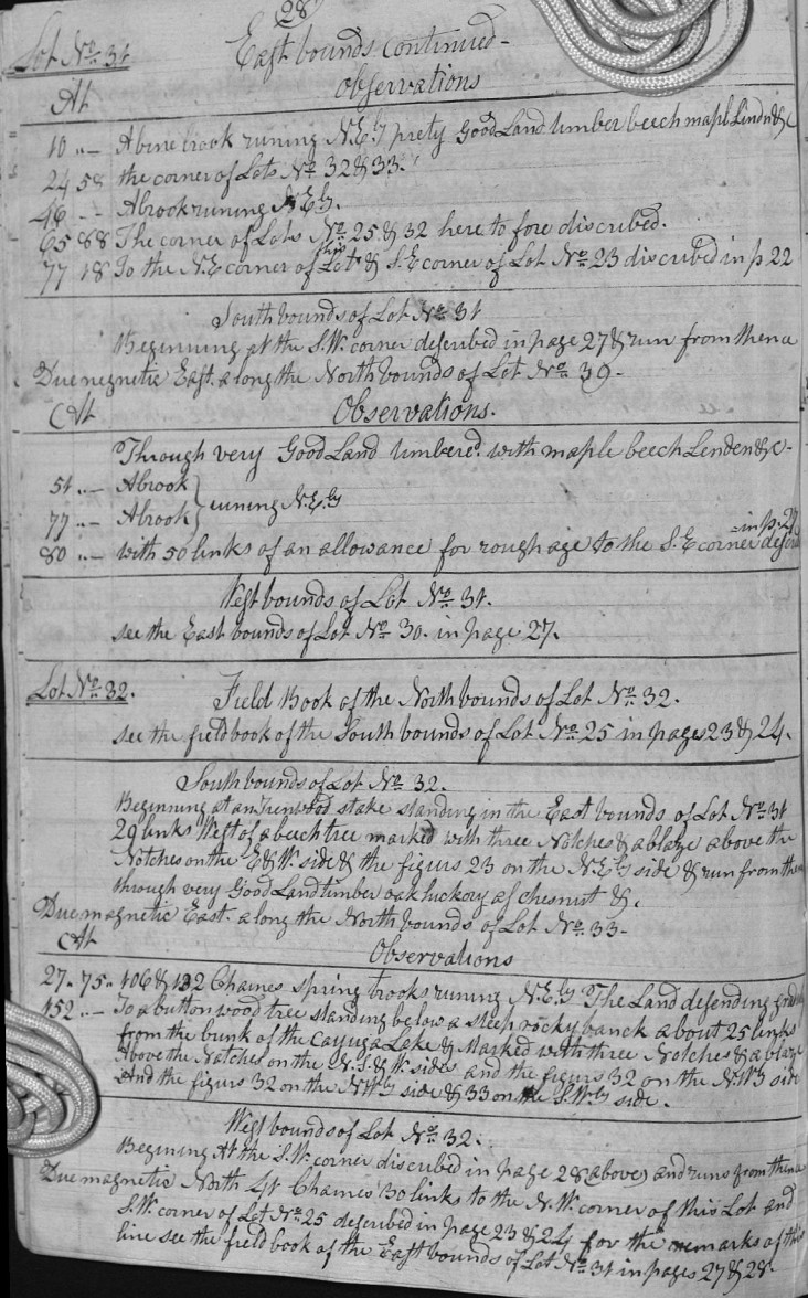 | 152 | - | To a buttonwood tree standing below a steep rocky banck about 25 links from the brink of the Cayuga Lake & Marked with three Notches & a blaze Above the Notches on the N.S.& W. sides and the figurs 32 on the N.Wly side And the figurs 32 on the NWly side & 33 on the S.Wly side. |