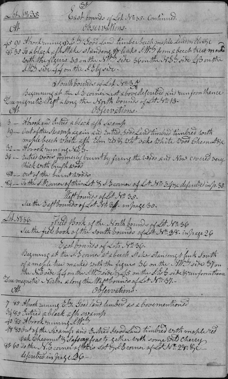 Begining at the S.E corner at a beech Stake standing 1 link South of a maple tree marked with the figurs 36 on the NWly side 37 on the N.E side 44 on the S.Wly side & 45 on the S.Ely side & run from thence
