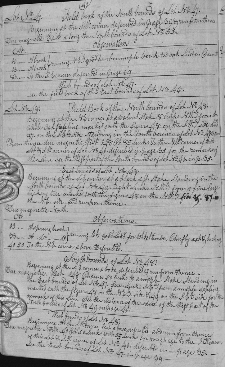 Beginning at the S.E corner above described & run from thence - Due magnetic. West. 148 Chaines 50 links to a maple Stake Standing in the East bounds of Lot No. 47. four Links S.Ely from a maple sapling marked with the figurs 48 on the N.Ely side & 49 on the S.Ely side for the remarks of this Line See the distance of the same of the West part of the North bounds of Lot No. 49 in page 41.