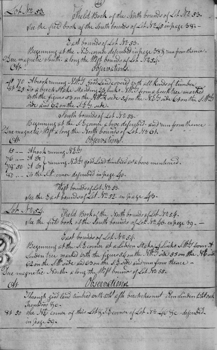 Beginning at the N.E. corner described in page 38 [45SE] & run from thence - Due magnetic South. along the West bounds of Lot No. 54.