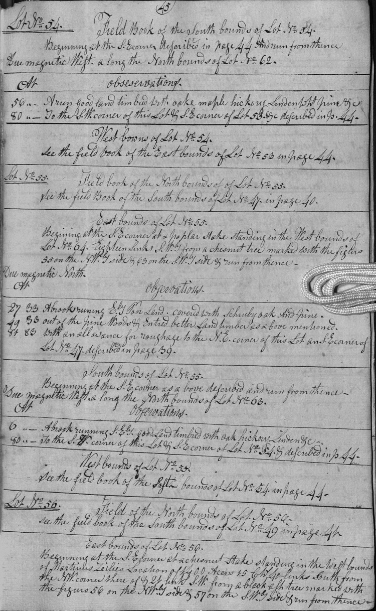 West bowns [bounds] of Lot No. 54. See the field book of the East bounds of Lot No. 53 in page 44.