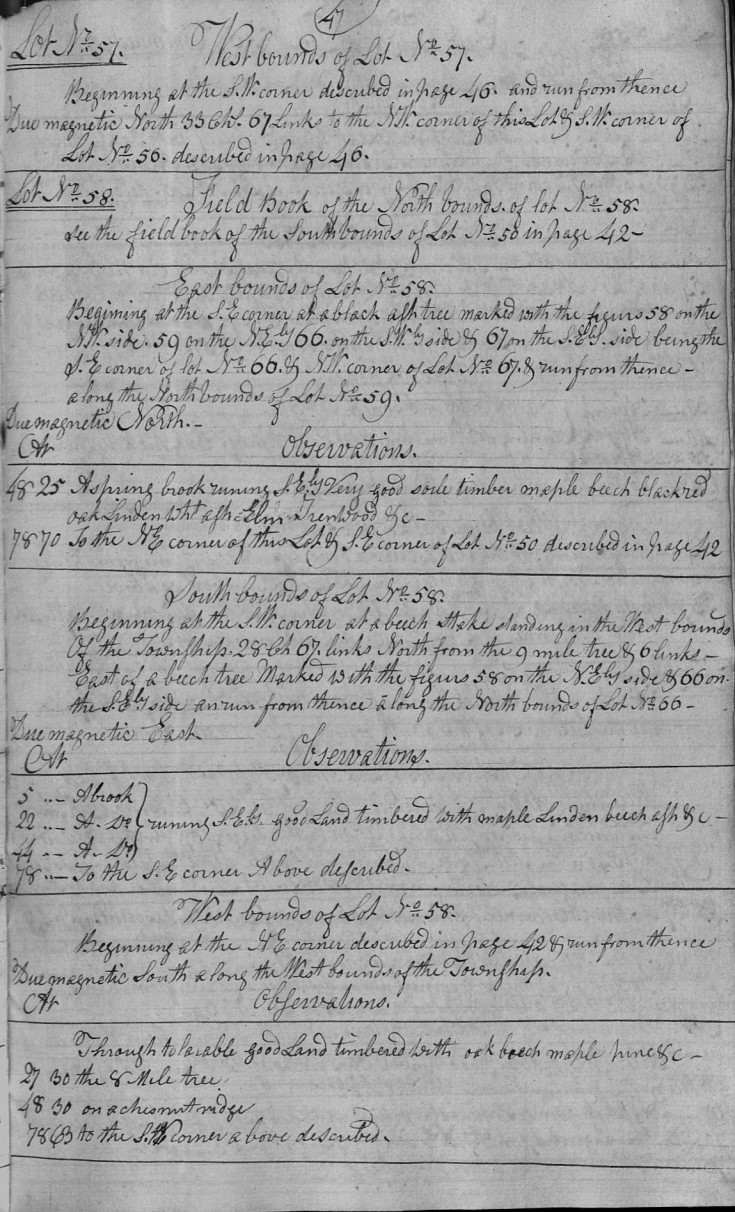 Beginning at the S.W. corner at a beech Stake standing in the West bounds Of the Township. 28 Ch 67. links North from the 9 mile tree & 6 links - East of a beech tree Marked with the figurs 58 on the N.Ely side & 66 on the S.Ely side an run from thence along the North bounds of Lot No. 66 -
