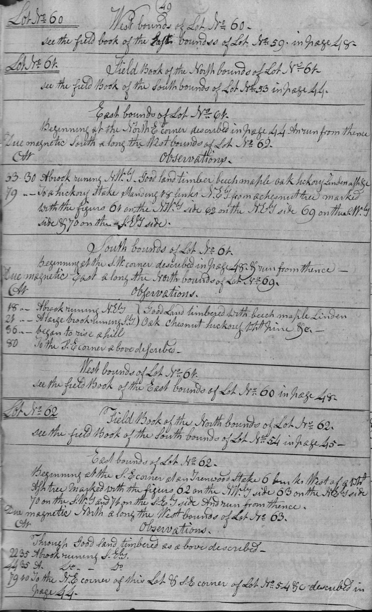 | 33 | 30 | A brook runing N.Wly Good land timber beech maple oak hickory Linden ash &c. |
