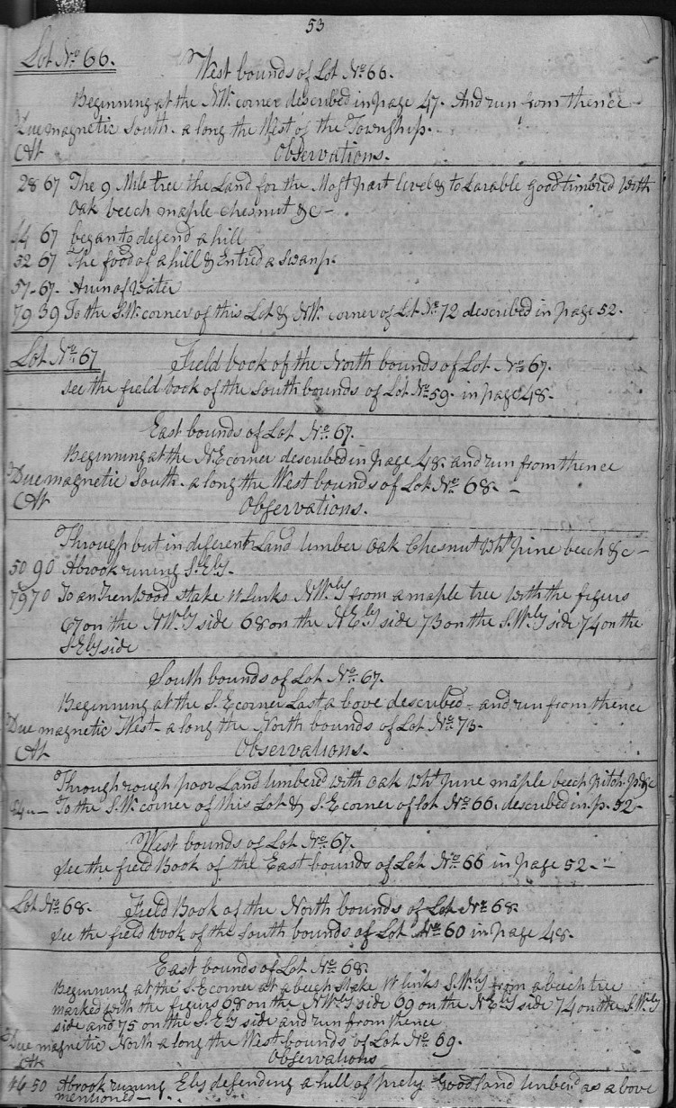 | 28 | 67 | The 9 Mile tree the Land for the Most part level & toLarable good timbred with oak beech maple chesnut &c - |