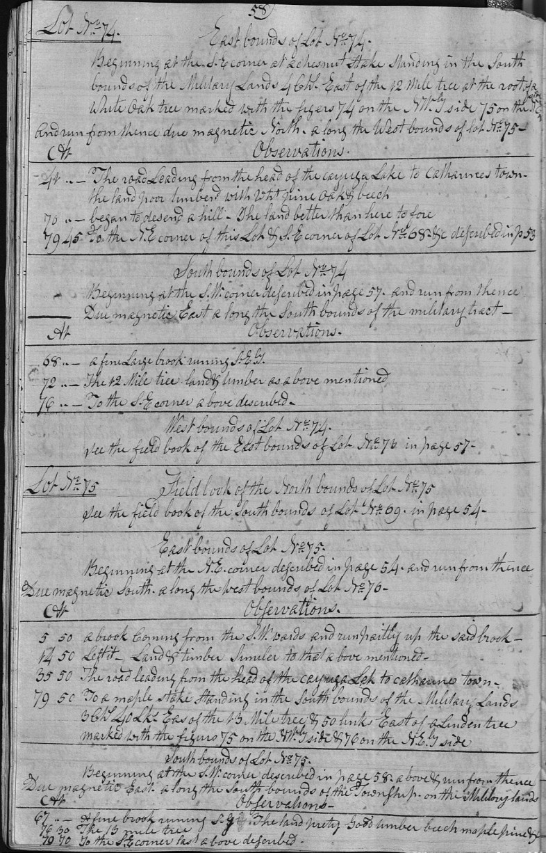 Beginning at the S.E corner at a chesnut Stake Standing in the South bounds of the Military Lands 4 Chs. East of the 12 Mile tree at the root of a White Oak tree marked with the figers 74 on the NWly side 75 on the NEly side